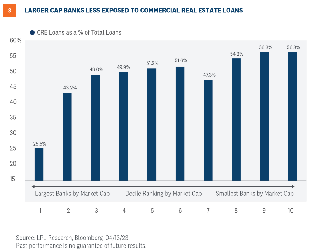 As noted above, banks are the largest holders of CRE loans. However, the proportion of CRE debt to total loans varies at the market cap level. In general, larger banks have less exposure as a percentage of their total loans compared to smaller cap regional banks. For example, CRE loans comprise around 25% of all loans for the largest U.S. banks, shown in Figure 3 under the first decile grouping. This compares to smaller cap banks that have a CRE to total loan ratio of over 50%. What does this mean for investors? Going up in market cap within the banking space should help reduce CRE risk.