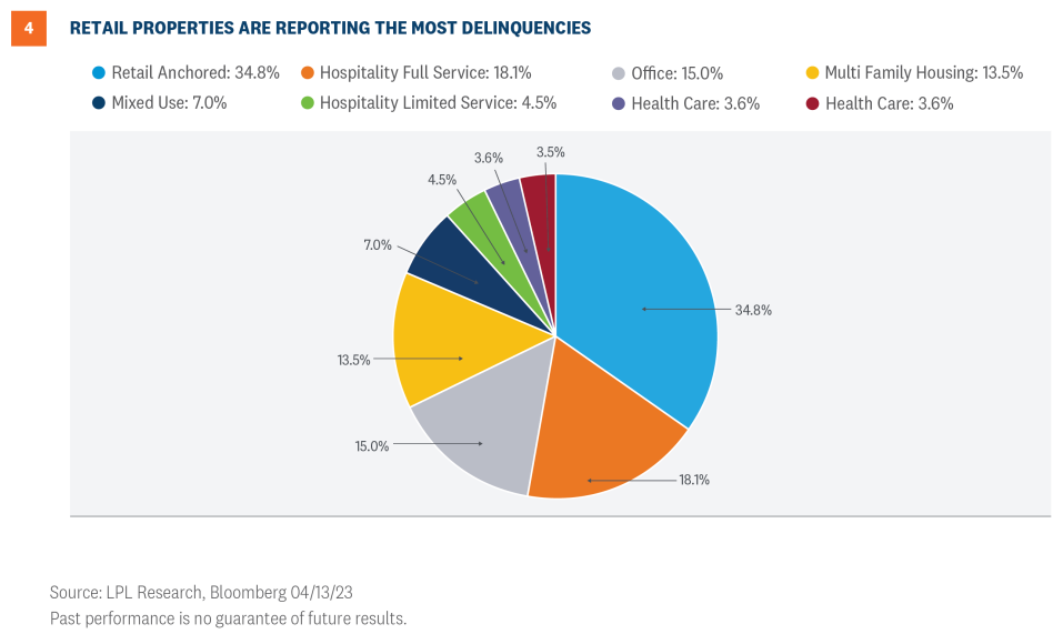 The silver lining is that capitalization (cap) rates, which are used to estimate the return on investment for properties, have climbed to over 9% for the office space segment, marking nearly a 3.0% increase since 2021. Most retail cap rate categories are up around 2% since 2021. If the Federal Reserve (Fed) ends its rate hiking cycle and inflation continues to track lower, and the U.S. economy avoids a recession, attractive cap rates could provide some downside support as investors search for higher yields.