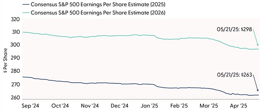 Good first quarter numbers are of course better than the alternative, but as investors, we are looking through the front windshield, not the rearview mirror. As we look forward, our vision is clouded by tariff uncertainty. Threats of higher tariffs on the European Union and Apple (AAPL) last week reminded investors that these rates could go higher. Even if tariffs stay at current rates, the overall weighted average global rate for U.S. imports would be around 13%, more than 10% above the rate when President Trump took office. Even this arguably best-case scenario would likely result in at least a 3% hit to S&P 500 EPS.