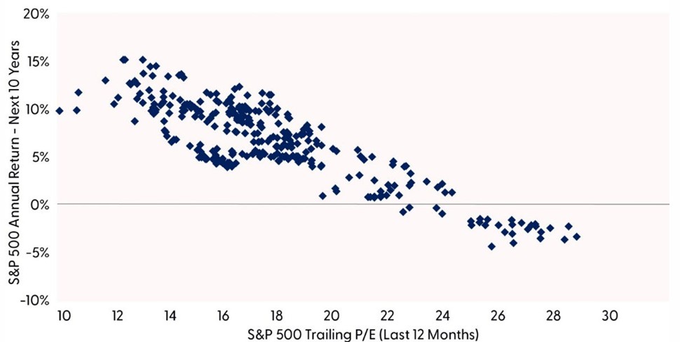 Valuations play a particularly critical role in our strategic framework, as historically they have demonstrated a high correlation with long-term market performance. The price-to-earnings ratio (P/E) for the S&P 500 Index, for example, has shown predictive power for subsequent decade-long returns, with higher P/Es typically preceding weaker long-term performance and lower P/Es often followed by stronger results. This relationship between starting valuations and subsequent returns supports patience and informs how we size risk exposure and tilt across styles within the SAA context.