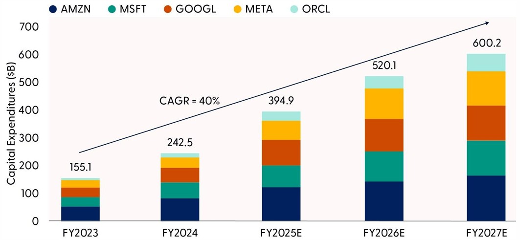 Hyperscalers include Alphabet (GOOG/L), Amazon (AMZN), Meta (META), Microsoft (MSFT), and Oracle (ORCL). Past performance is no guarantee of future results.