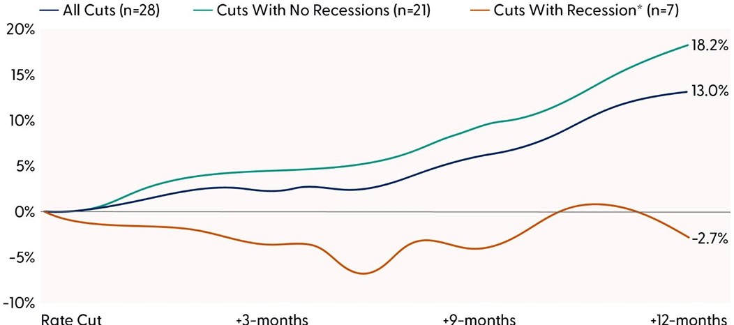 Disclosures: At/Near record highs defined as periods when the S&P 500 was within 3% of an all-time high. Data based on dates from 1984-YTD. Cuts with recession are defined as Federal Reserve interest rates occurring within six months of a recession. All indexes are unmanaged and cannot be invested in directly. Past performance is no guarantee of future results.
