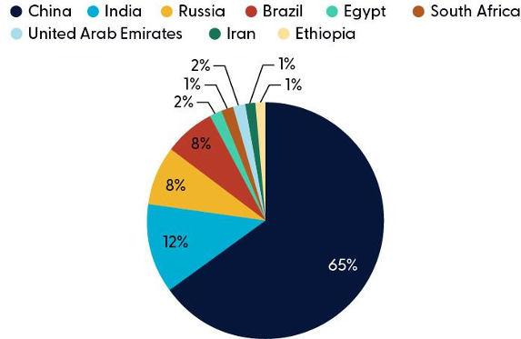 Pie chart represents the percent of gross domestic product each BRIC+ country composes.