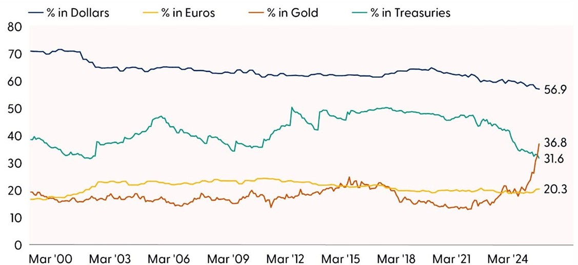 • Weaker U.S. Dollar and Debasement Trends: A weaker U.S. dollar helped fuel the metals rally by making gold and silver more appealing to global investors. At the same time, mounting concerns over expansive fiscal spending, rising debt burdens, questions around Fed independence, and ongoing signs of dollar debasement added further momentum to the melt‑up in metals. Although we do not believe the dollar is at risk of losing its reserve‑currency status — given the lack of a viable alternative — central banks continue to diversify away from the greenback and U.S. Treasuries. This shift in reserve behavior traces back to the 2022 seizure of more than $300 billion in Russian dollar assets following the invasion of Ukraine, an event that reshaped perceptions of currency safety. As shown in the “Foreign Reserve Holdings by Asset,” gold has now surpassed both Treasuries and the euro as a share of global reserves, making it the second‑largest holding behind the dollar.