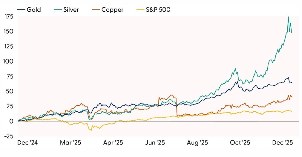 The melt‑up in the metals market that defined 2025 has extended its strength into the early weeks of the new year, reinforcing the commodity sector’s position as one of the leading asset classes across global markets. To the surprise of most, gold outperformed the broader equity market for a third consecutive year, surging roughly 65% in 2025 and far exceeding the S&P 500’s gains. Silver delivered an even more extraordinary performance, posting its best year since 1979 with annual gains near 150% and reaching generational price highs. The rally, however, cannot be attributed solely to a weaker U.S. dollar or the resumption of the Federal Reserve’s (Fed) rate‑cutting cycle in September. Policy dynamics ranging from robust central‑bank gold purchases to evolving trade and geopolitical strategies significantly influenced price action across the metals landscape. Together with structural supply shortages and rising industrial demand, these factors have created a powerful backdrop that continues to shape market volatility and performance. In this week’s Weekly Market Commentary, we explore the drivers behind the strength in metals, the associated risks, and the outlook for the durability of the rally.