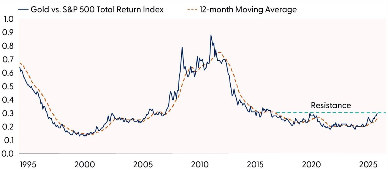 The metals market enters 2026 with strong momentum. A supportive monetary policy backdrop, elevated safe haven demand, trade frictions, and tightening global supplies all reinforce a bullish outlook for both precious and industrial metals. Additionally, significant ETF inflows and a weaker dollar have amplified the rally as central banks increasingly diversify away from U.S. assets. Rising metal prices — especially copper — may also reignite inflation pressures in the year ahead, given their historical influence on input costs across the global economy. Technical trends show gold approaching a critical long-term inflection point versus equities, suggesting the potential for continued outperformance if resistance breaks.